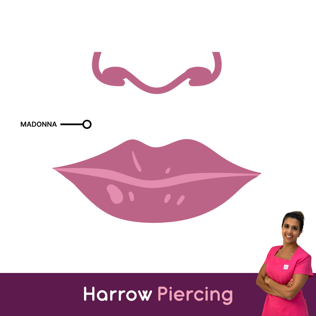 A Madonna piercing sits on the upper lip area to mimic a beauty spot look. Placement is tailored to your facial features for the best result.