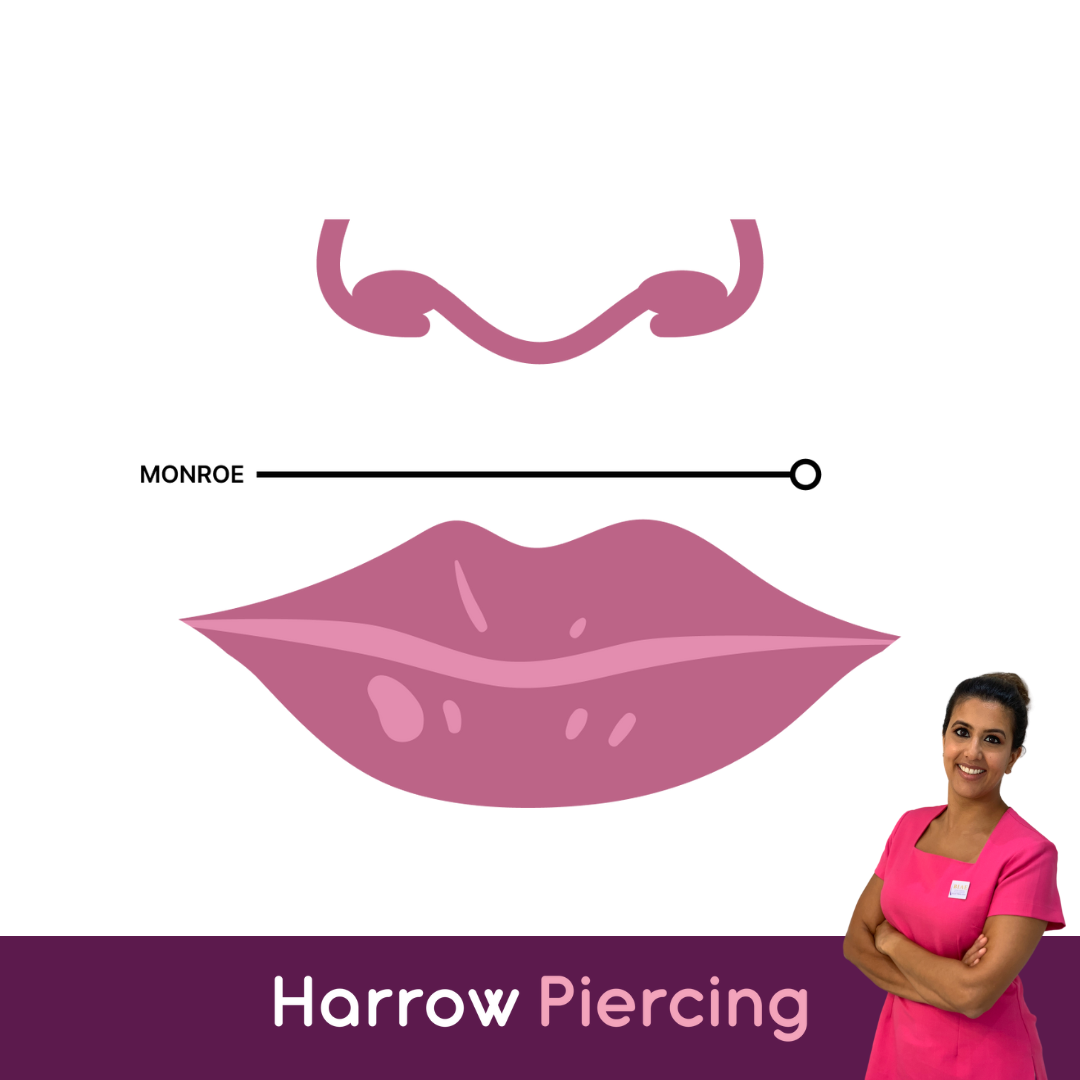 A Monroe piercing sits on the upper lip area on one side for a beauty spot look. Placement can be adjusted to suit your face shape.