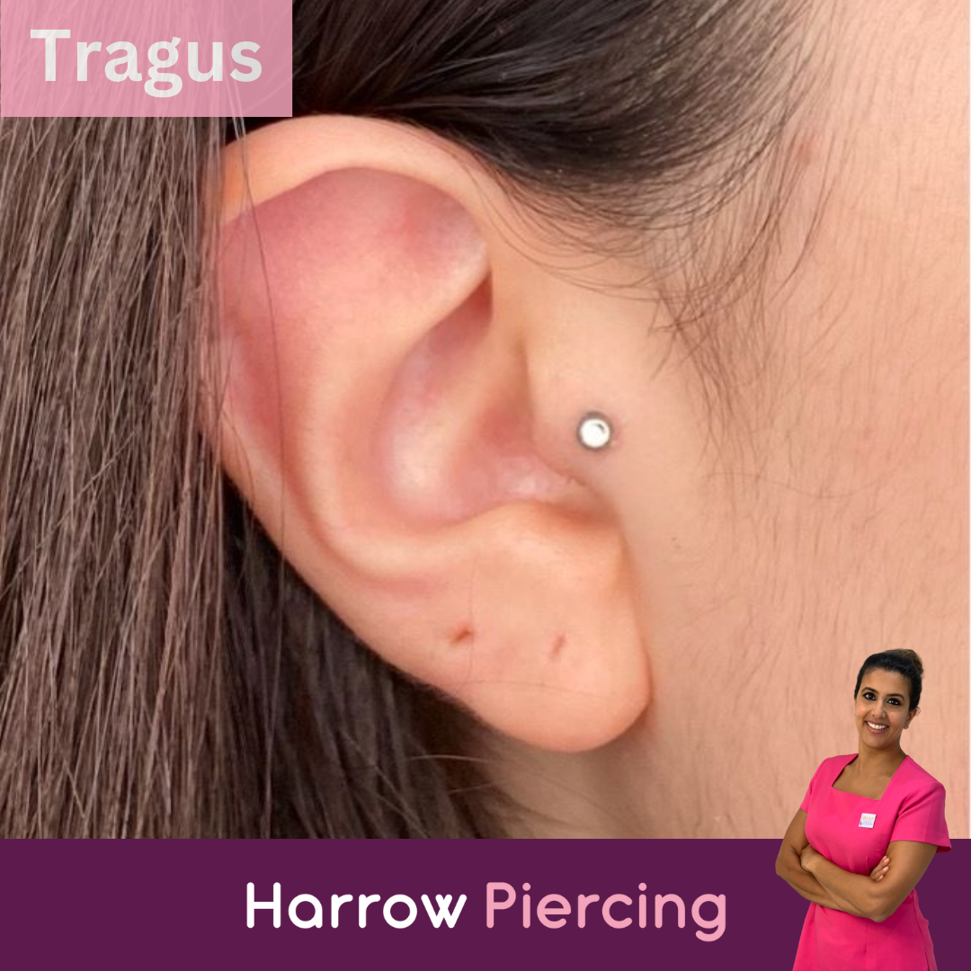 A tragus piercing sits through the small cartilage flap in front of the ear canal. It is a popular choice for a neat, minimal look.