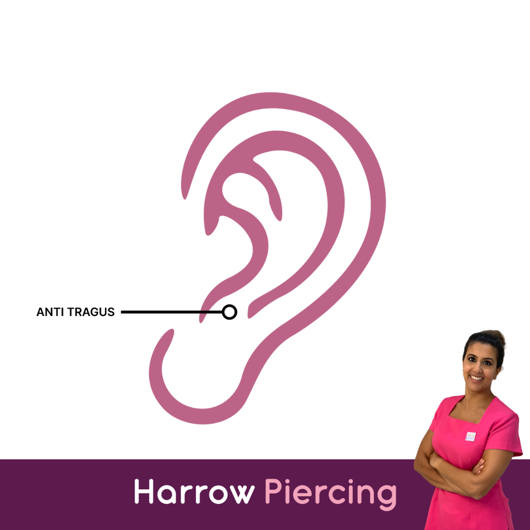 An anti tragus piercing sits through the cartilage ridge above the earlobe, opposite the tragus. It is a distinctive ear piercing and is more anatomy dependent than some placements.